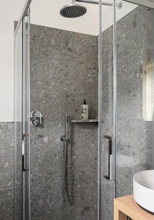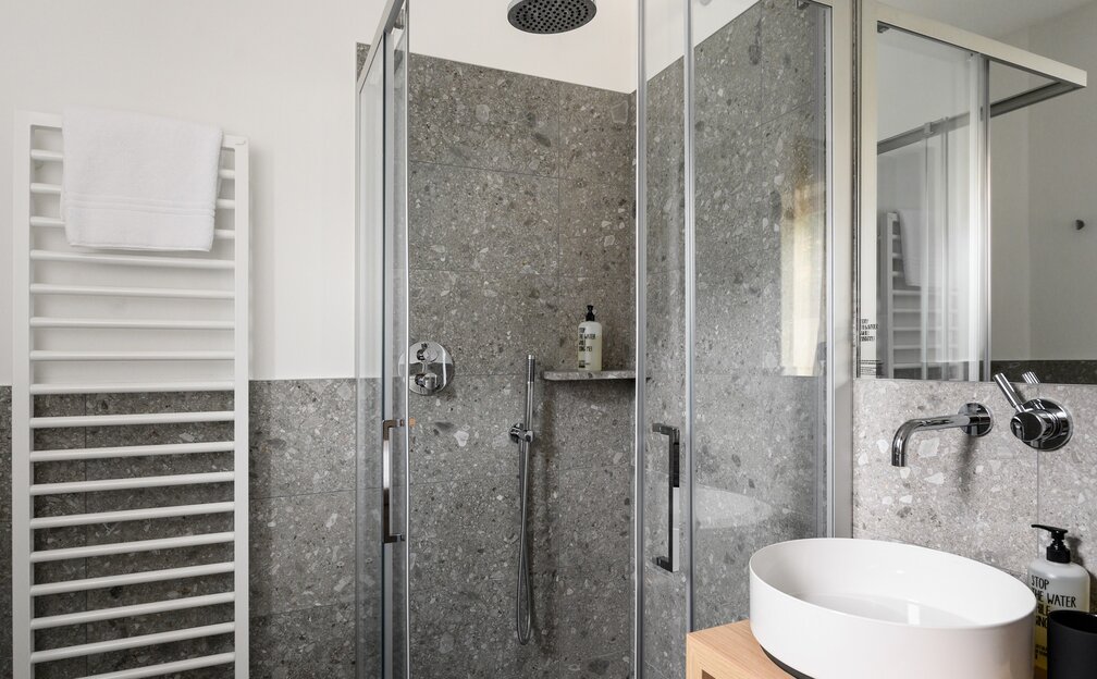 - Badezimmer mit Regendusche, Biopflegeprodukte von „Comfort Zone“, Kosmetikspiegel und Föhn