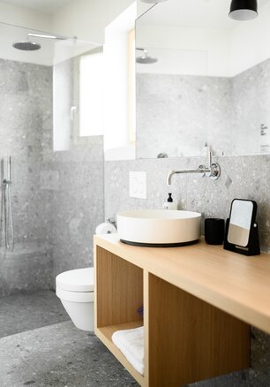 - offenes Badezimmer mit begehbarer Regendusche, Biopflegeprodukte von „Comfort Zone“ und Föhn