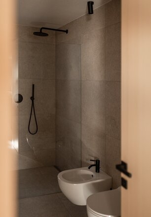 - Badezimmer mit Fußbodenheizung, begehbarer Regendusche, Bidet, Biopflegeprodukte von „Comfort Zone“, Kosmetikspiegel und Föhn