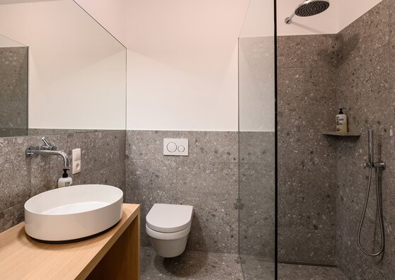 - Badezimmer mit Fußbodenheizung, begehbarer Regendusche, teilweise Bidet, Biopflegeprodukte von „Comfort Zone“, Kosmetikspiegel und Föhn